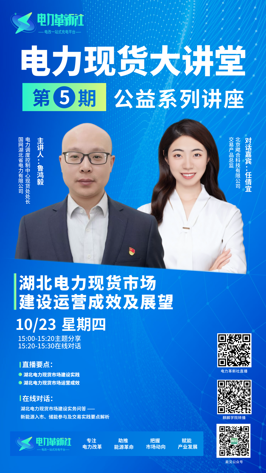 10月23日,飔合科技交易产品总监任倩宜参与了由国家电力调度控制中心大力支持的“电力现货大讲堂”公益系列直播课,与国网湖北省电力有限公司电力调度控制中心现货处处长鲁鸿毅共话湖北电力现货市场。