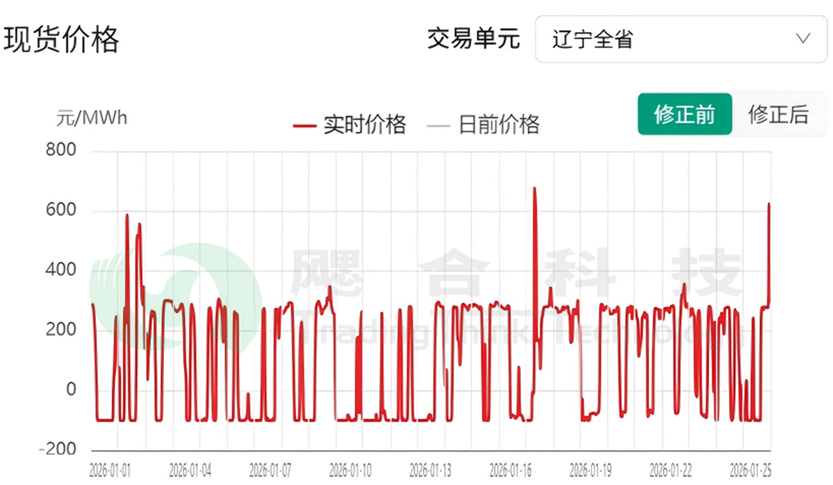 2026年1月1日起,辽宁电力市场实施《辽宁省电力市场配套实施细则(试行4.0版)》规则,现货市场正式引入申报和出清下限-0.1元/千瓦时(俗称“-100”)。2026年1月1日至25日,辽宁现货市场实时出清价格-0.1元/千瓦时约272小时,时段占比42.83%。