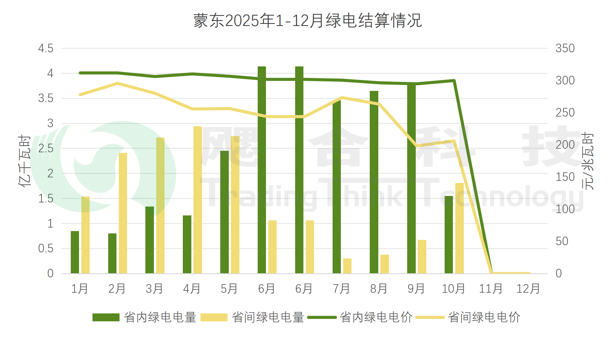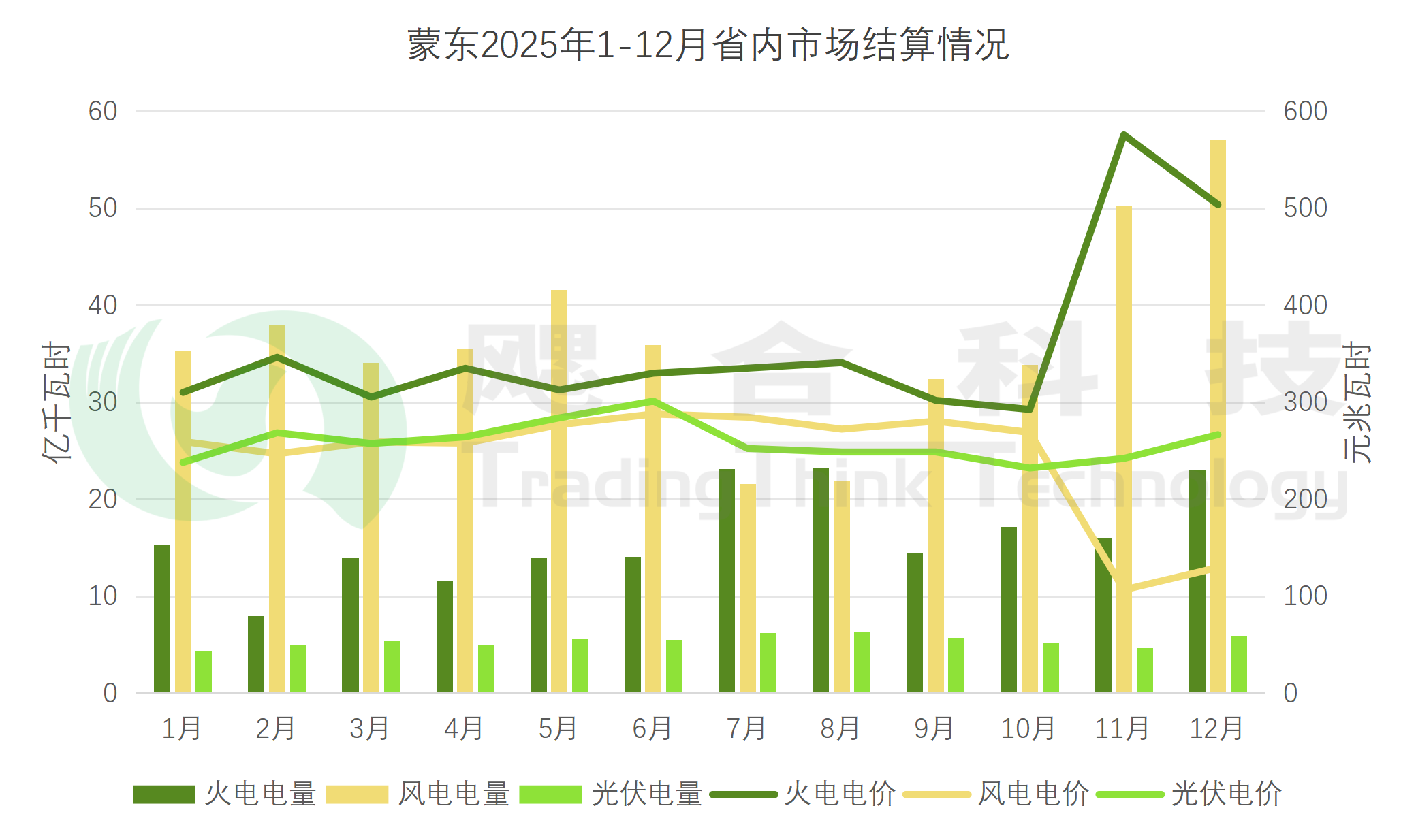 2025年蒙东省内市场累计结算电量837.63亿千瓦时,其中火电结算电量194.14亿千瓦时,结算均价364.01元/兆瓦时;风电结算电量437.73亿千瓦时,结算均价232.06元/兆瓦时;光伏结算电量65.02亿千瓦时,结算均价259.29元/兆瓦时。全年累计结算绿电电量39.76亿千瓦时,其中省内绿电结算电量23.18亿千瓦时,结算均价301.34元/兆瓦时;省间绿电结算电量16.58亿千瓦时,结算均价259.65元/兆瓦时。