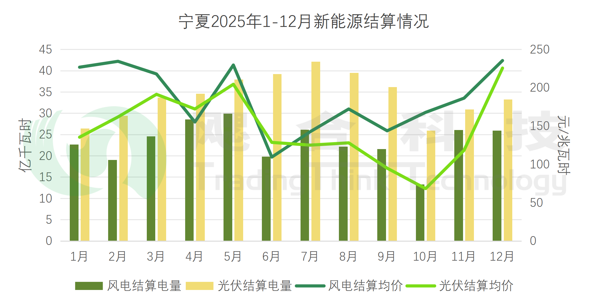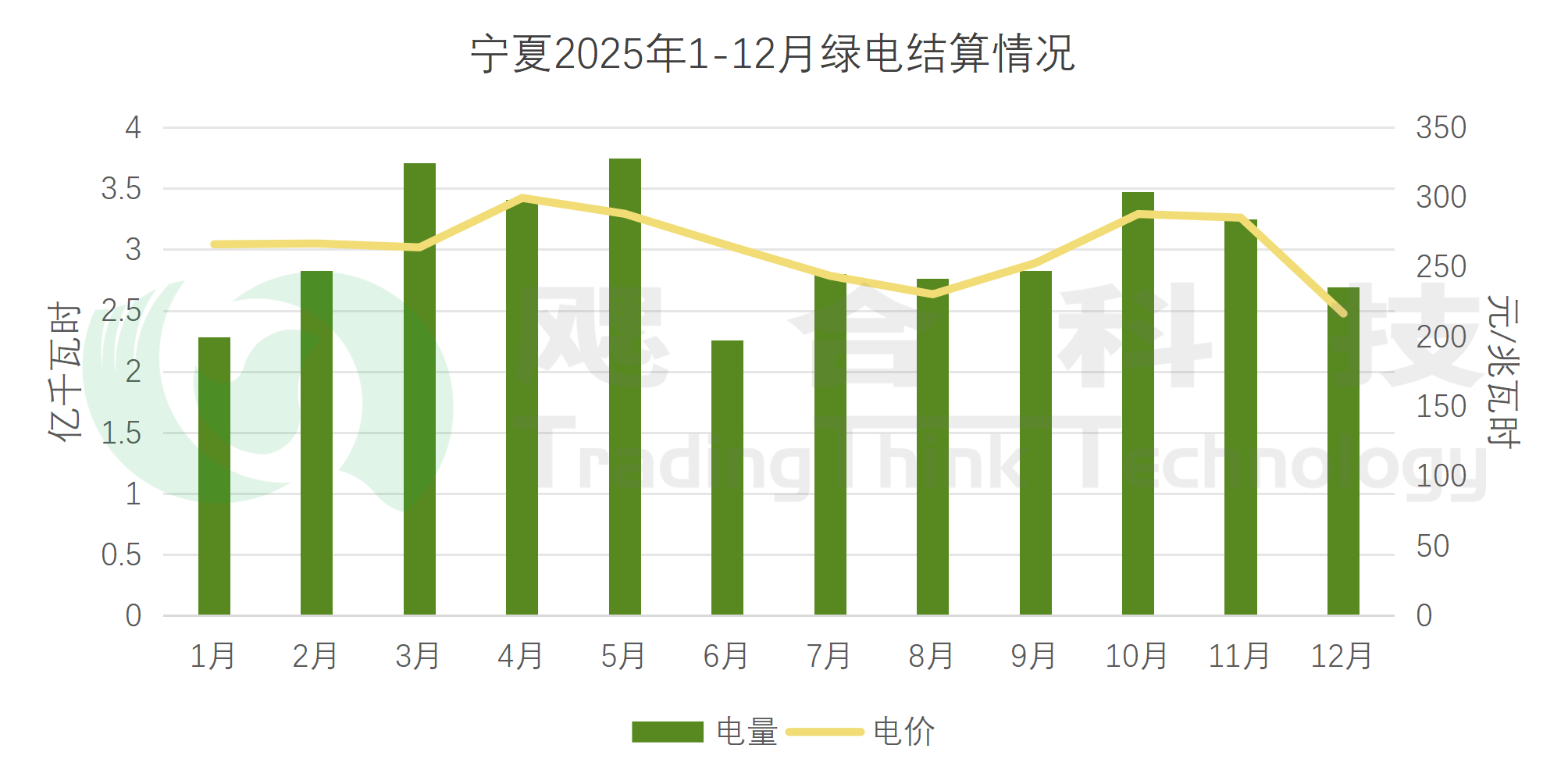 2025年1-12月宁夏新能源结算情况如下:风电结算电量共279.83亿千瓦时,结算均价186.97元/兆瓦时;光伏结算电量共409.12亿千瓦时,结算均价147.35元/兆瓦时。绿电结算电量为36.04亿兆瓦时,结算均价为266.21元/兆瓦时。