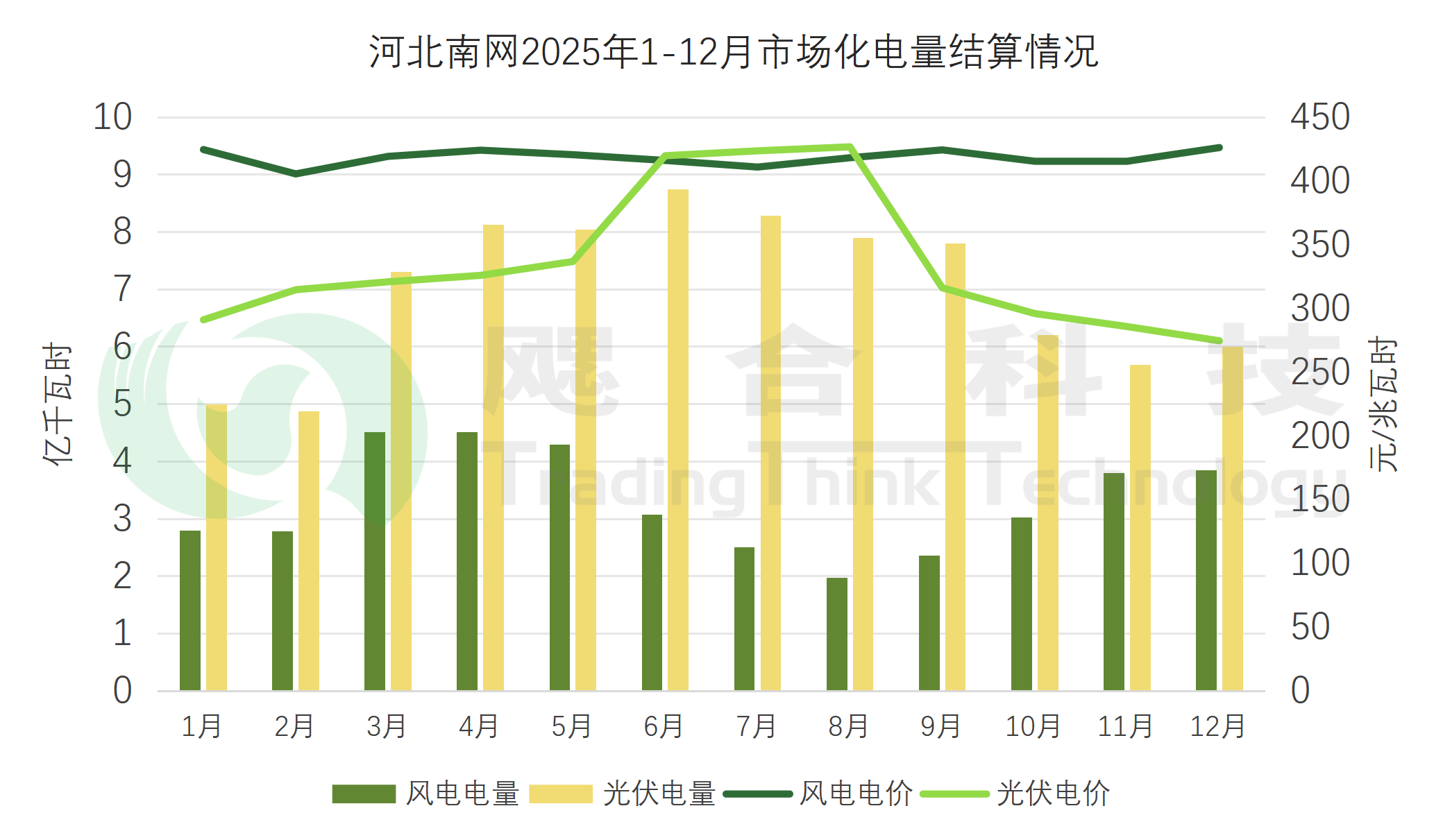 河北南网3月1日起进行现货连续结算试运行。由于年度持仓比例高,现货结算试运行对新能源场站结算电价影响不大。光伏电价呈现出明显的季节特性,夏季阳光充足,光伏出力高。2025年风电结算均价418.96元/兆瓦时,结算电量39.46亿千瓦时;光伏结算均价343.29元/兆瓦时,结算电量83.96亿千瓦时。