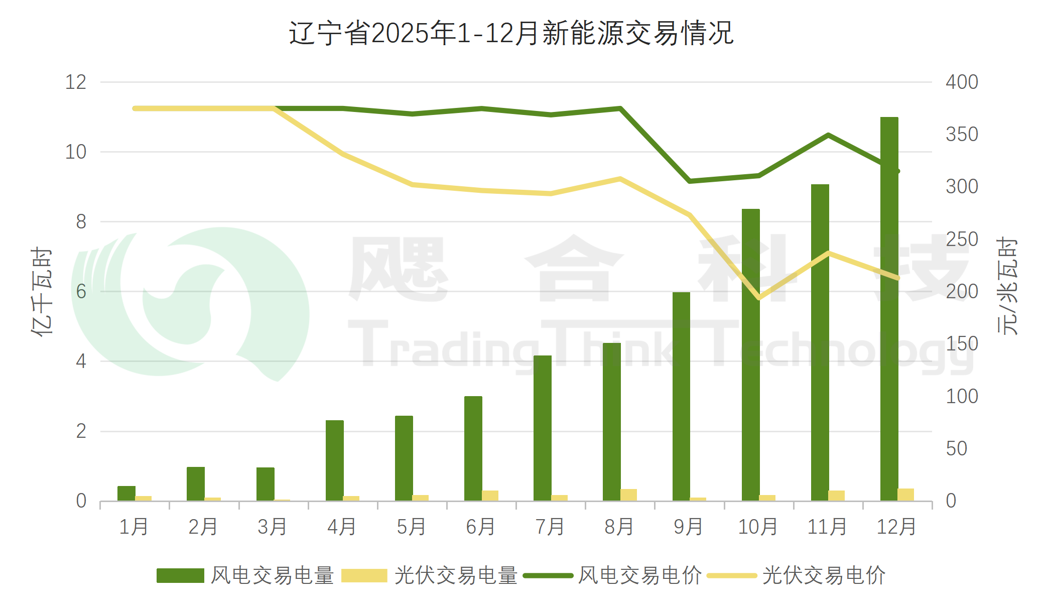 2025年1-12月辽宁省新能源市场化机组电能量结算均价:风电机组结算电量为379.15亿千瓦时,结算均价318.60元/兆瓦时;光伏机组结算电量77.66亿千瓦时,结算均价375.71元/兆瓦时。