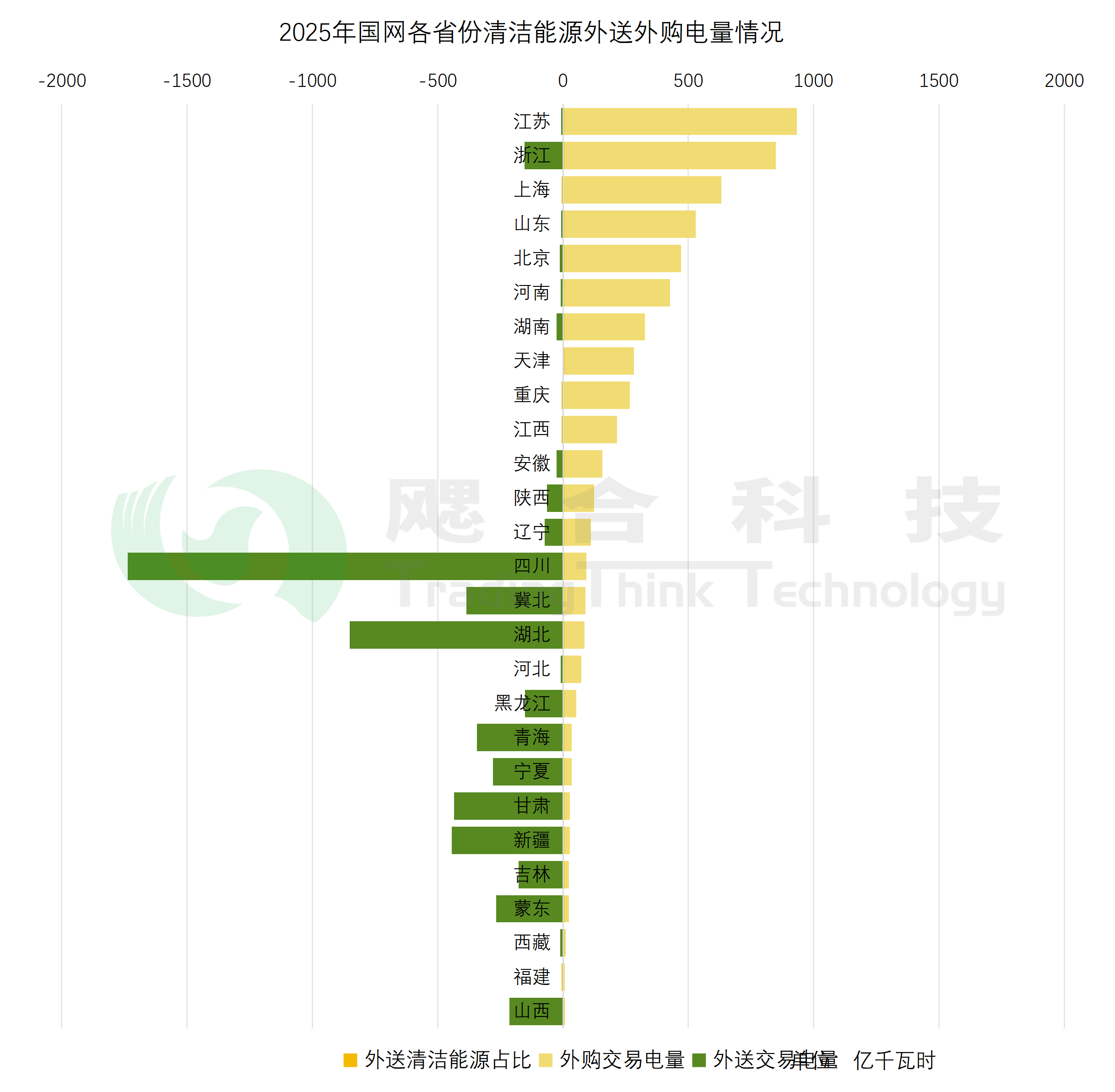 2025年,省间清洁能源消纳7591亿千瓦时,同比增长16.3%。其中,水电省间外送电量3929亿千瓦时,同比增长3.8%;新能源省间外送电量3177亿千瓦时,同比增长41.1%。从省间清洁能源送受规模来看,四川、湖北、新疆、甘肃送出电量较大;江苏、浙江、上海受入电量较大。