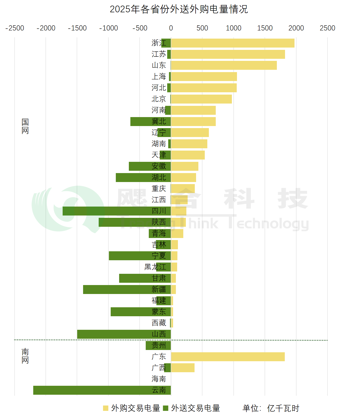 下图的条形图为2025年国网、南网各省份外送、外购电量情况。国网四川、山西、新疆 3 个省送出电量较大,浙江、江苏、山东 3个省外购电量较大,南网云南送出电量较大,广东购入电量较大。
