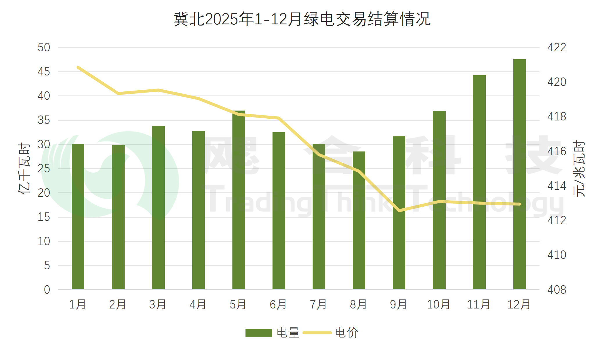 冀北地区2025年1-6月绿电结算电量415.1亿千瓦时,结算均价416.18元/兆瓦时。