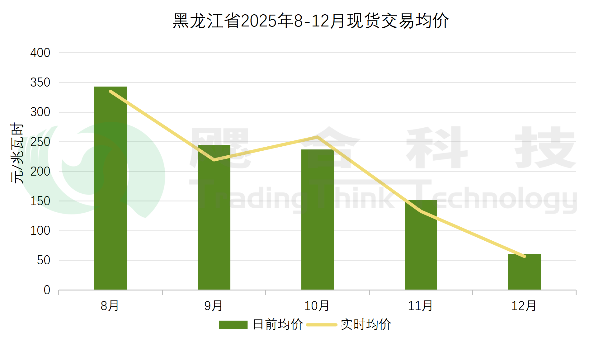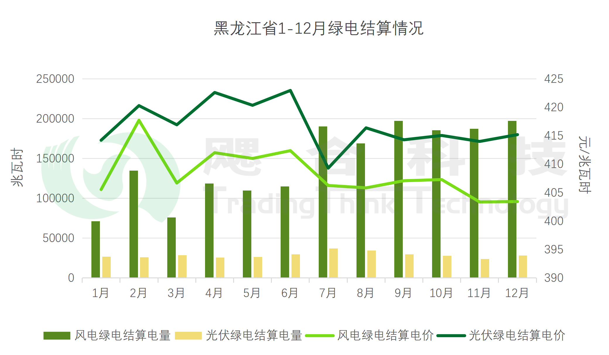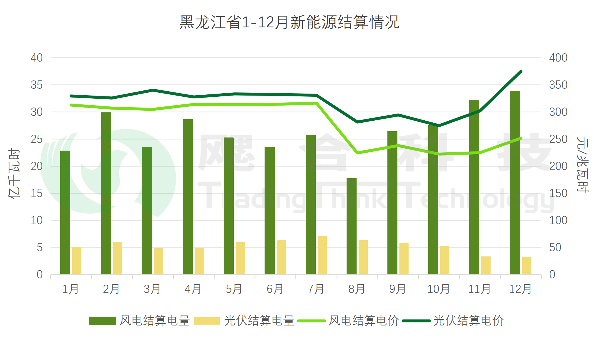 黑龙江省2025年8-12月,现货日前均价207.44元/兆瓦时,实时均价200.41元/兆瓦时。2025年1-12月新能源总计结算电量为381.28亿千瓦时,风电1-12月结算均价为277.79元/兆瓦时,光伏1-12月结算均价为319.12元/兆瓦时。绿电结算方面,风电结算电量为17.54亿千瓦时,结算均价407.77元/兆瓦时;光伏结算电量为3.45亿千瓦时,结算均价为416.61元/兆瓦时。