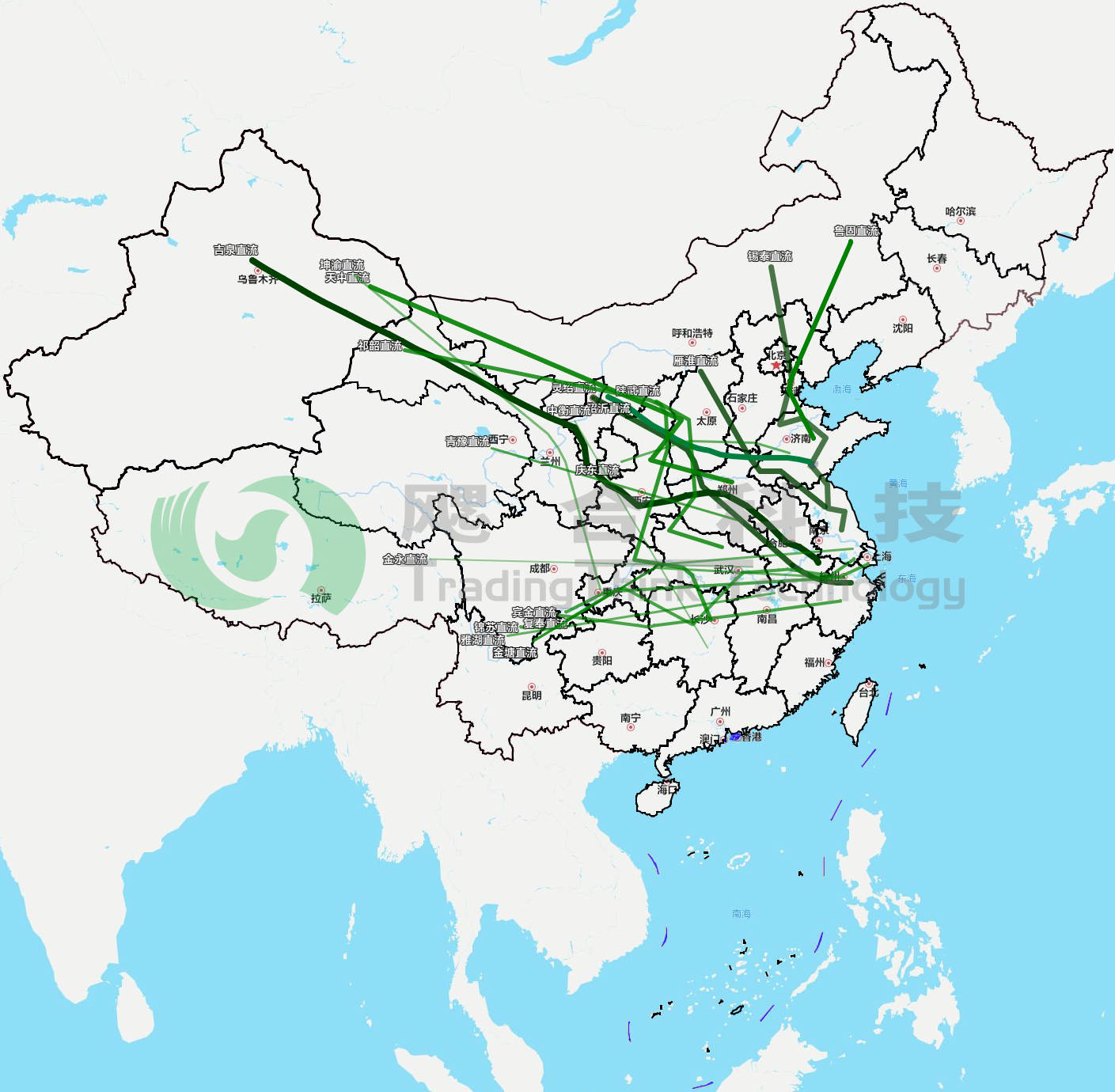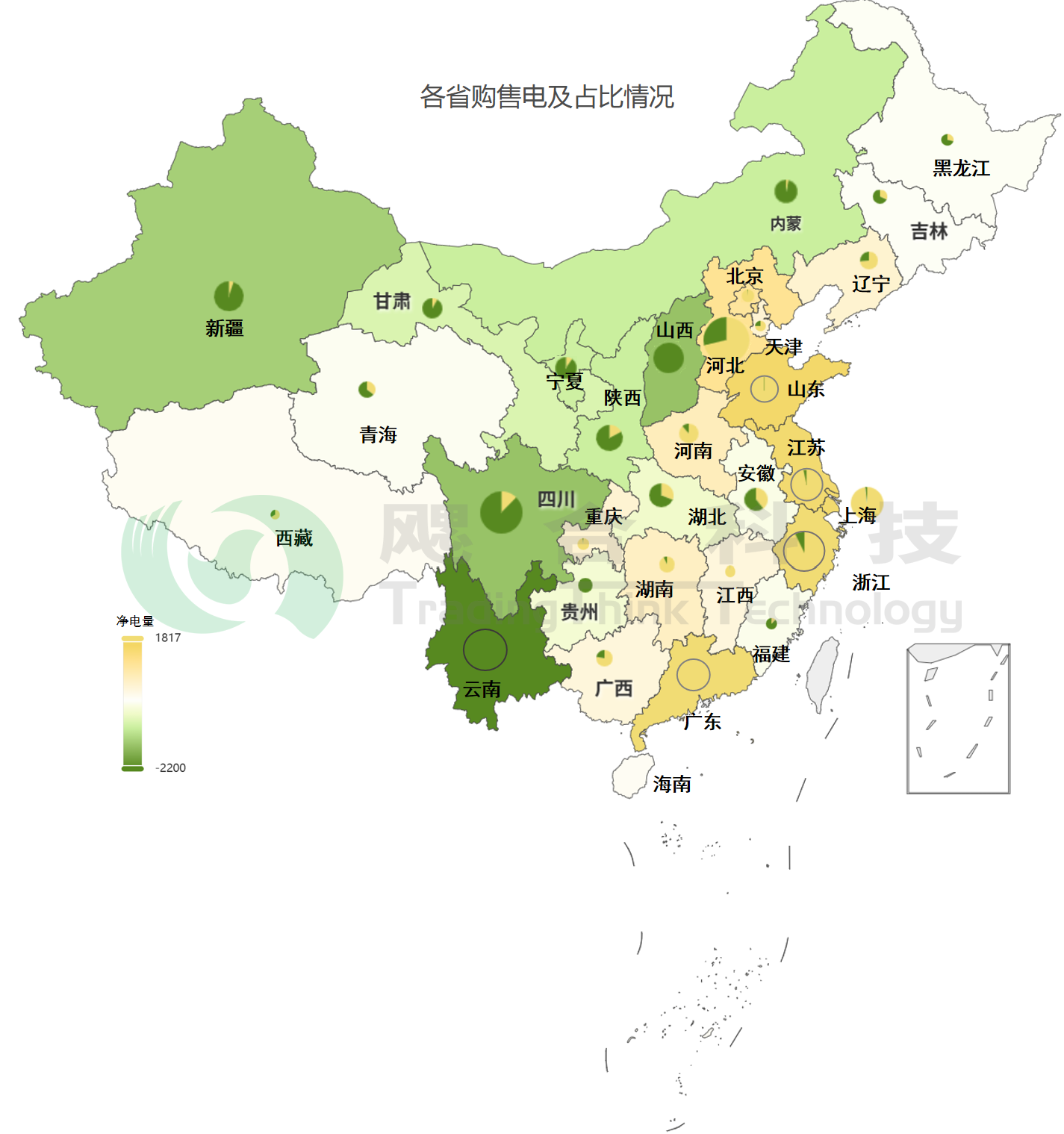 下图为各省外购电量与外送电量的差值,每个省份的颜色越绿代表外送越多,越黄代表外购电量越多。外购与外送电量的合计值代表总交易电量,总交易电量越多,饼图越大,饼图中的绿色、黄色分别代表外送、外购电量的占比。