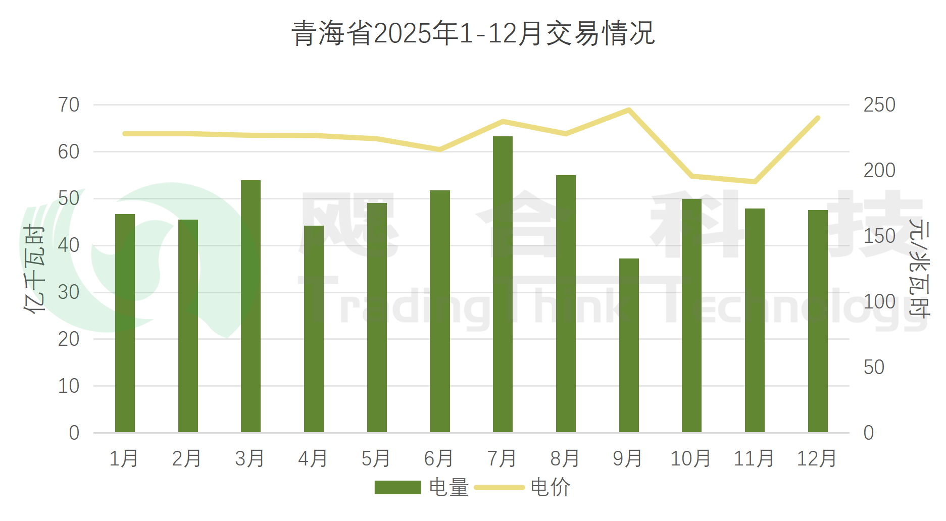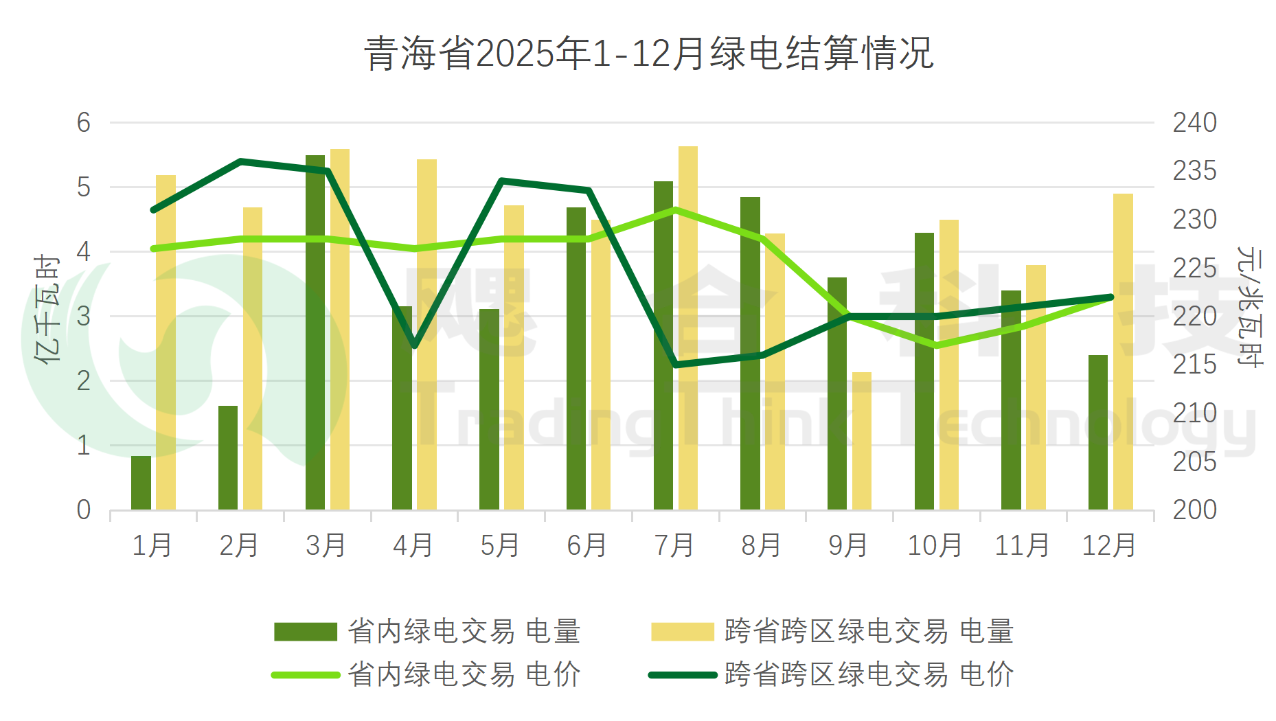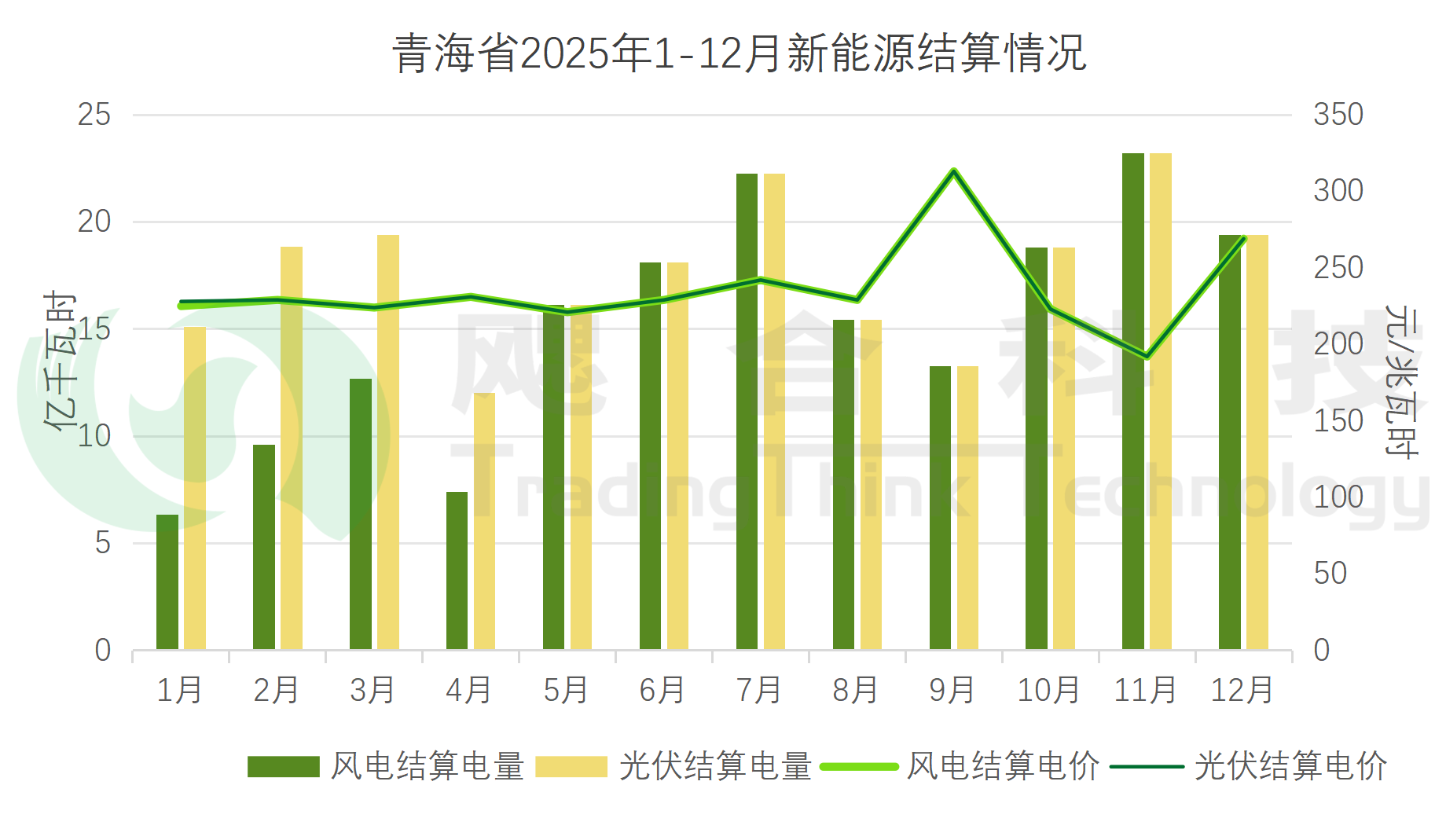 2025年1-12月青海省新能源交易情况如下:交易电量共592.03亿千瓦时,交易均价223.76元/兆瓦时。青海省结算绿电情况如下:省内绿电交易电量共42.57亿千瓦时,结算均价225.42元/兆瓦时,跨省跨区绿电交易电量共55.39亿千瓦时,结算均价225.28元/兆瓦时。新能源结算情况如下:风电结算电量共89.84亿千瓦时,结算均价219.92元/兆瓦时;光伏结算电量共212.00亿千瓦时,结算均价233.67元/兆瓦时。