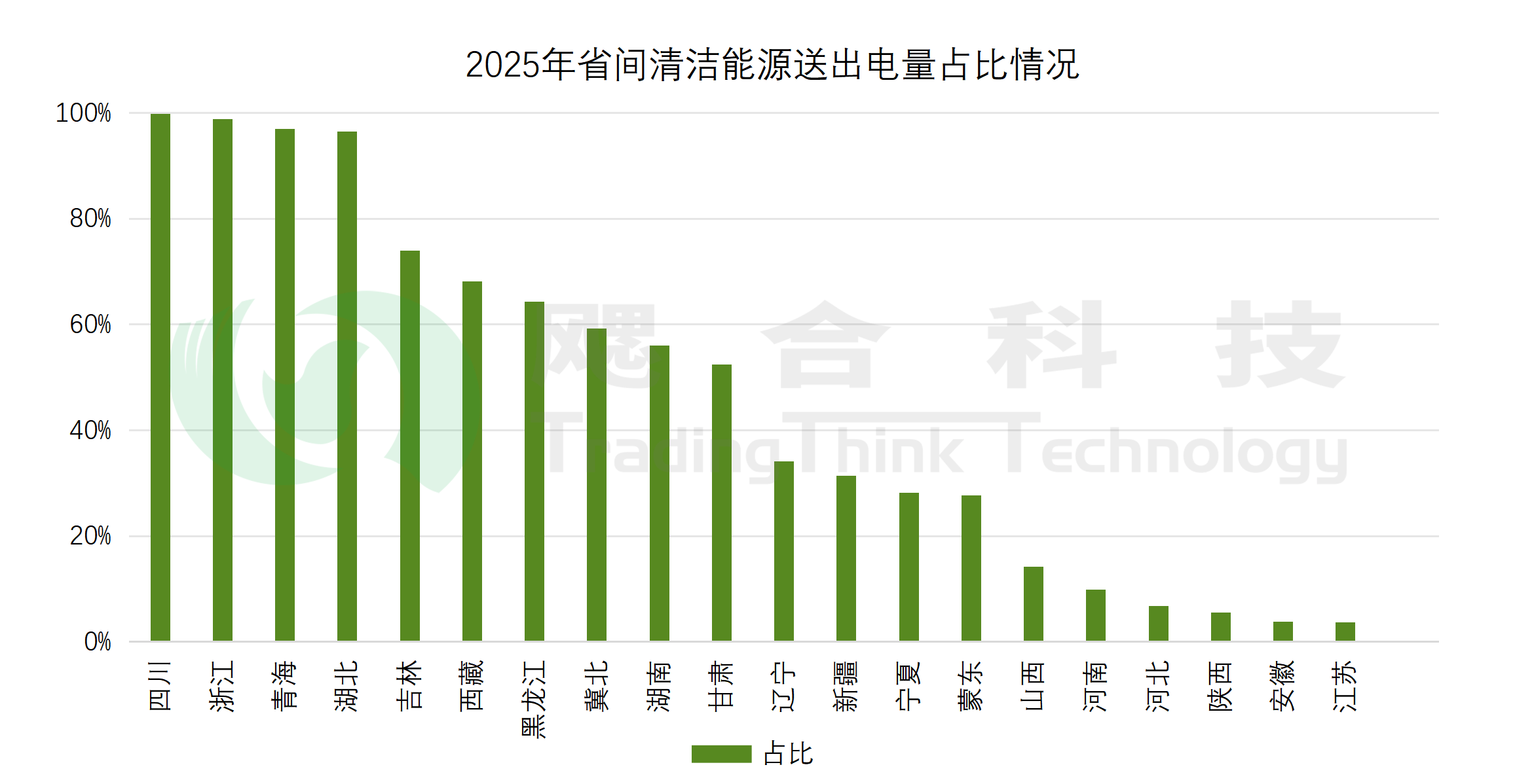 四川、湖北外送电量相对较多且普遍为清洁能源,青海、浙江外送电量相对较少,但清洁能源占比高;江苏、安徽、陕西、河北、河南、山西外送的清洁能源占比较少,均在20%以下,其中,作为外送大省的山西、陕西外送电量依旧以火电为主。