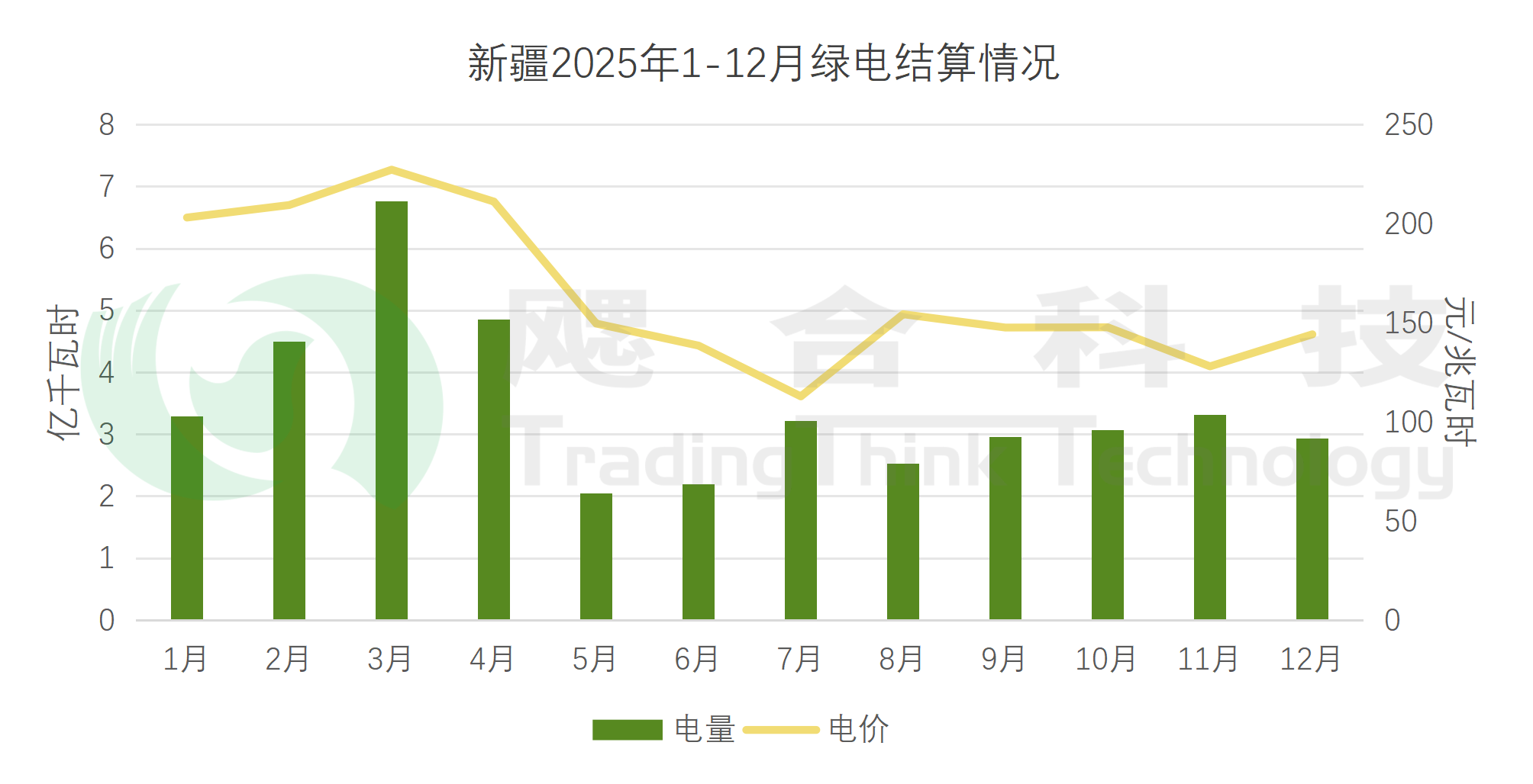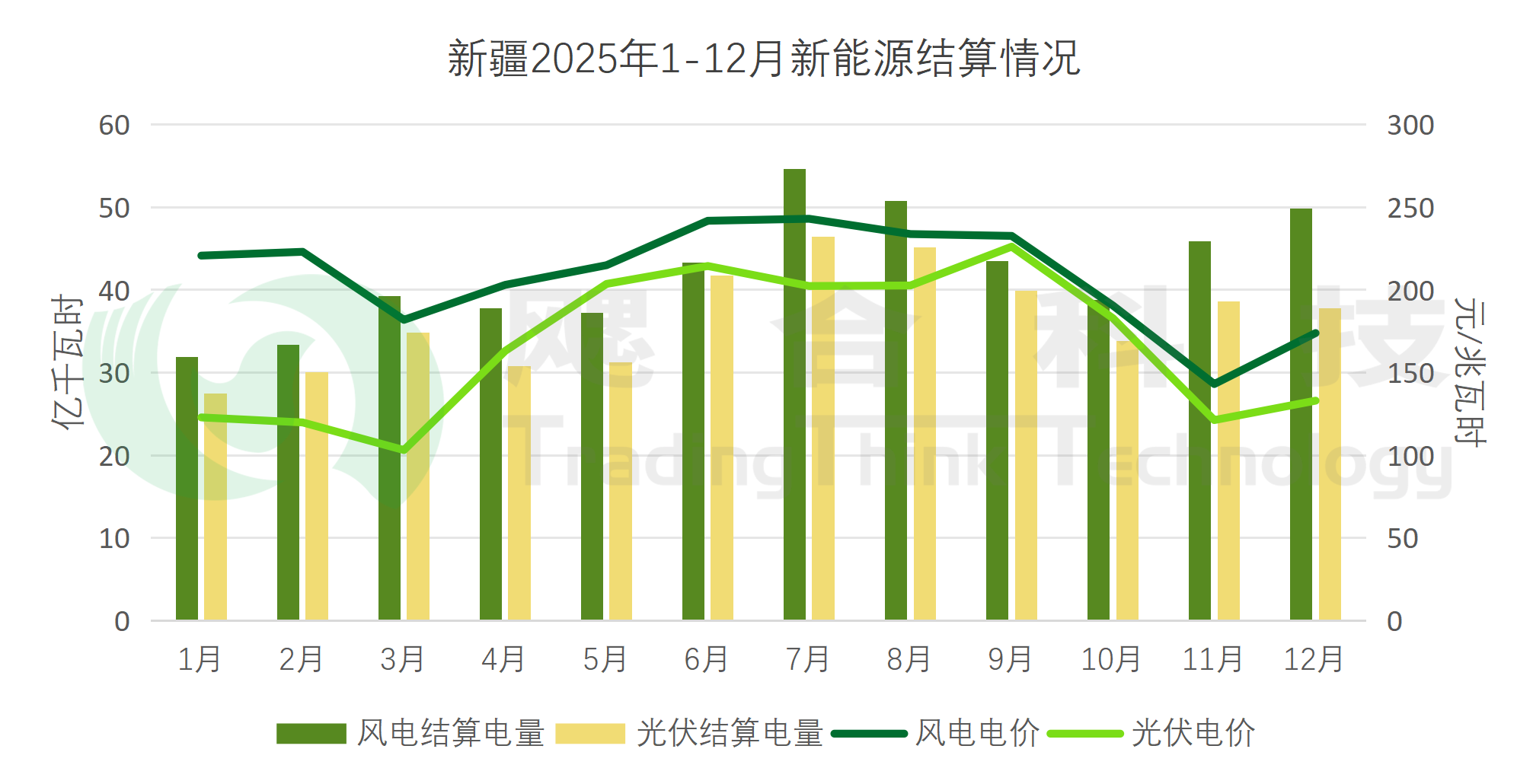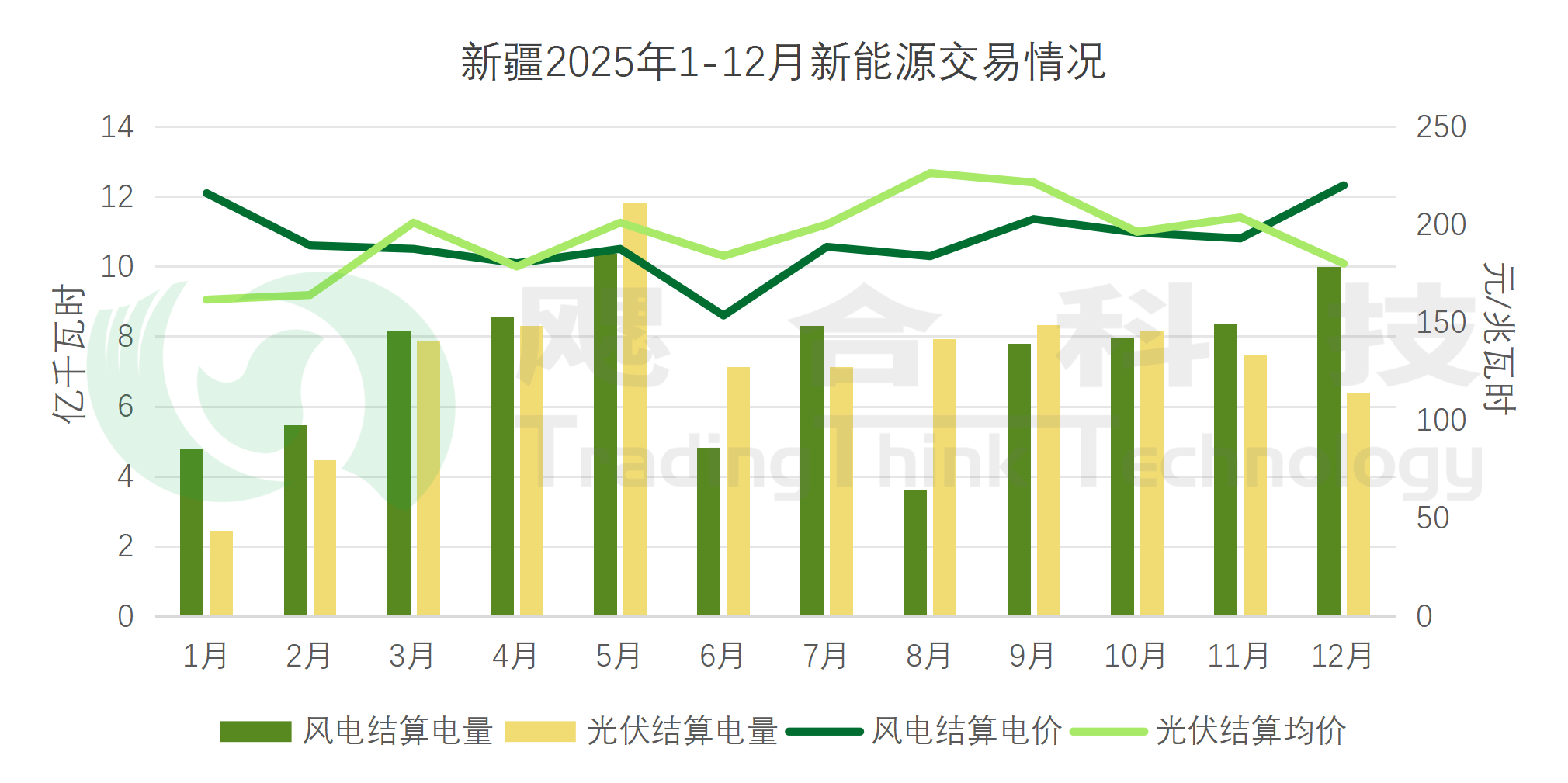 2025年1-12月新疆新能源交易情况如下:交易电量共175.79亿千瓦时,交易均价195.15元/兆瓦时;新能源结算情况如下:风电结算电量共506.12亿千瓦时,结算均价208.72元/兆瓦时;光伏结算电量共437.77亿千瓦时,结算均价169.87元/兆瓦时。绿电结算电量为41.68亿千瓦时,结算均价为174.66元/兆瓦时。