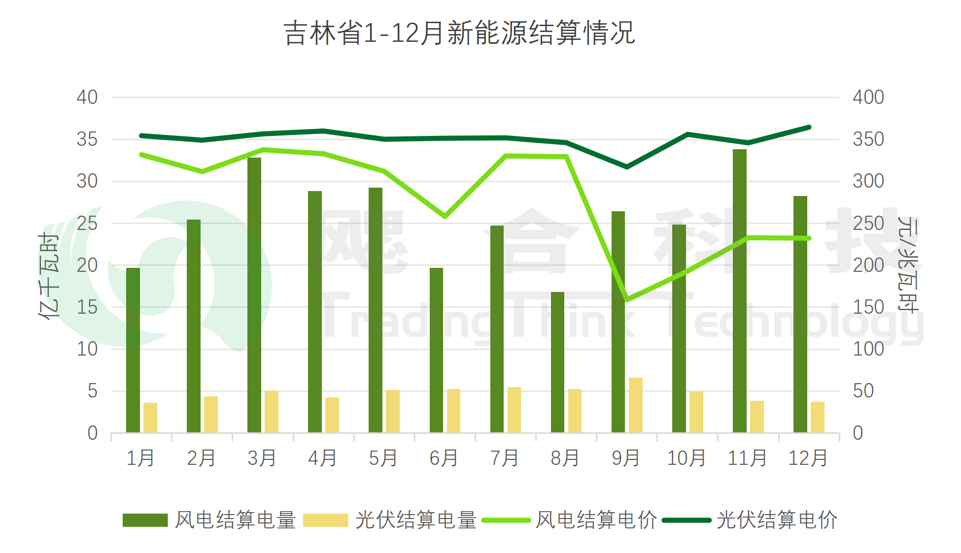 吉林新能源机组电能量结算均价情况如下:风电机组总计结算电量为310.76亿千瓦时,结算电价为278.46元/兆瓦时;光伏机组结算电量为57.43亿千瓦时,结算电价为348.93元/兆瓦时。其中光伏结算价格比较稳定,受现货市场影响较小;风电结算价格在现货月下降明显。