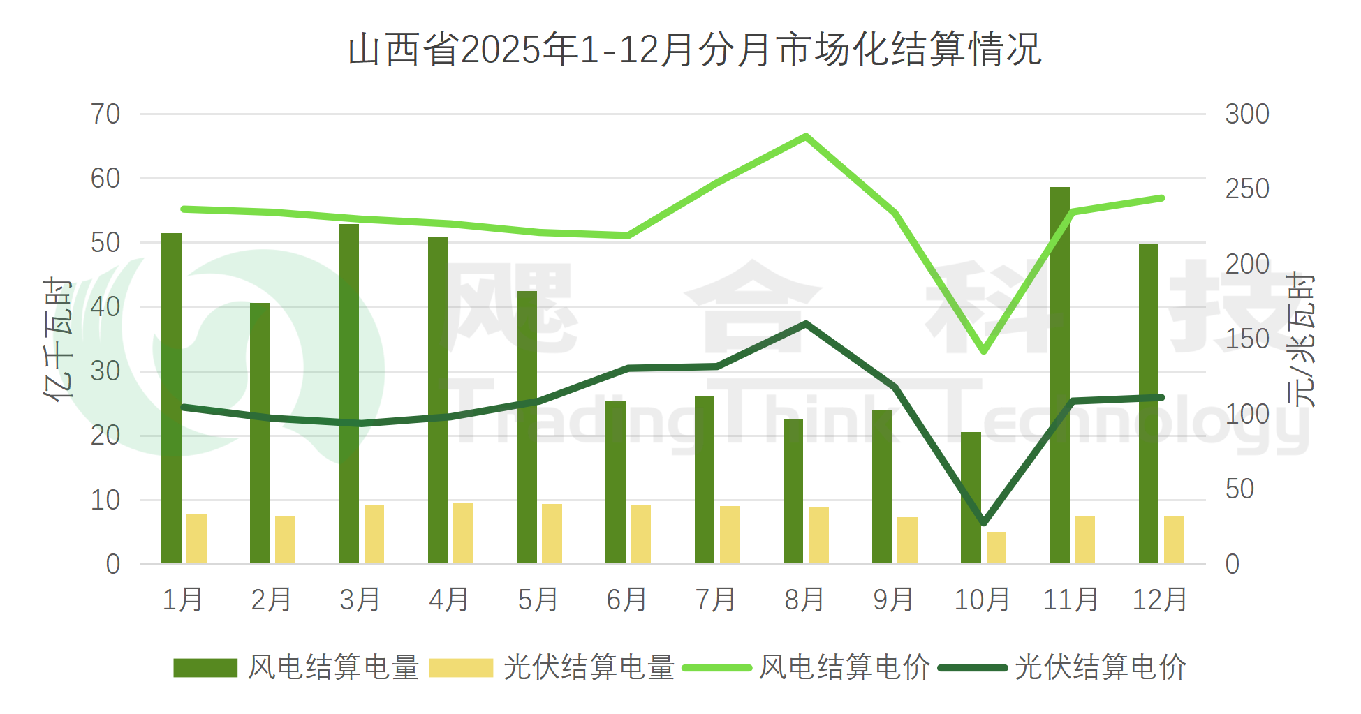 2025年,山西现货机组风电结算电量465.71亿千瓦时,结算均价231.9元/兆瓦时,光伏结算电量97.82亿千瓦时,结算均价110.63元/兆瓦时。