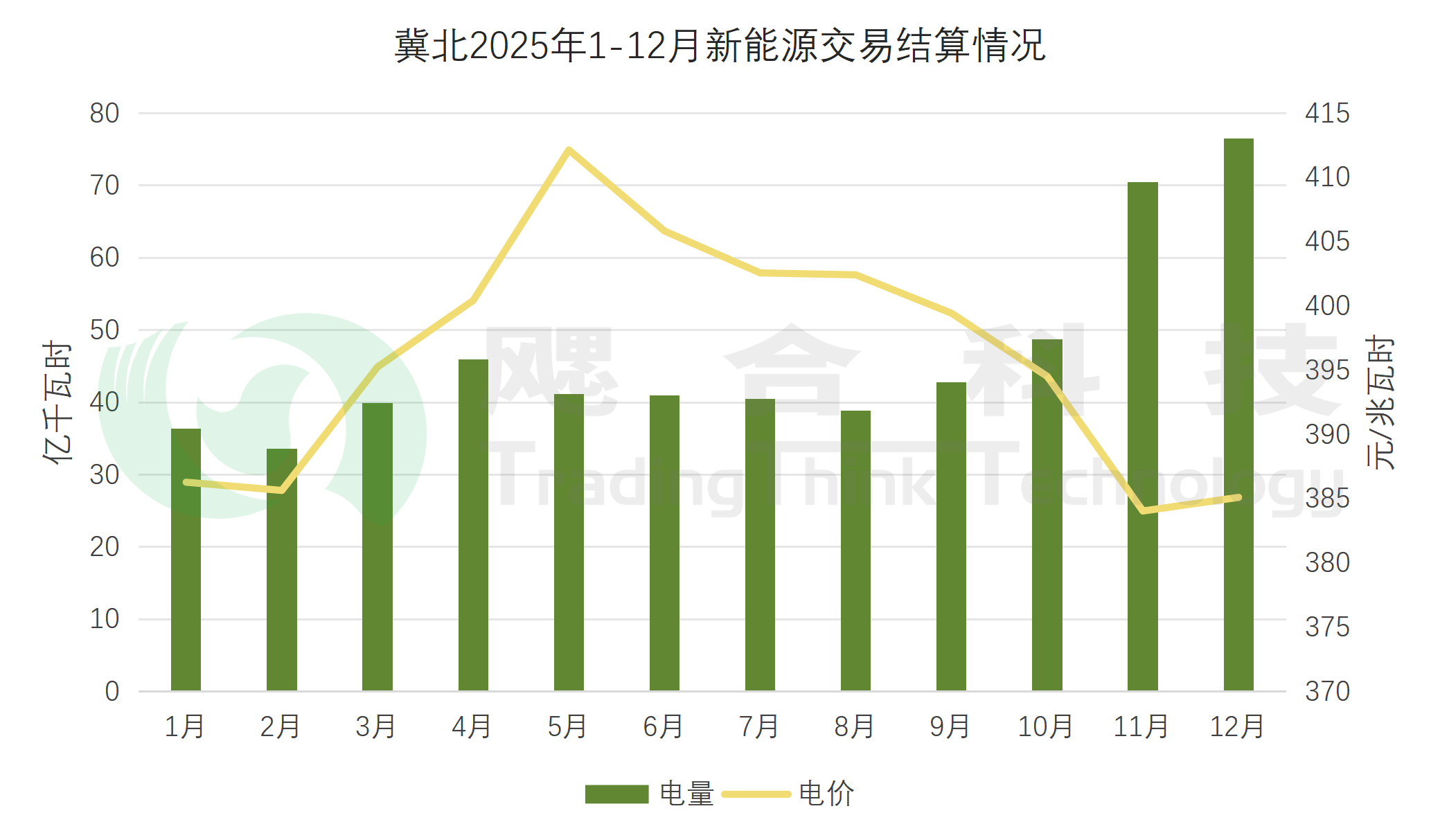 冀北地区2025年1-12月新能源交易结算电量555.97亿千瓦时,结算均价395.02元/兆瓦时。