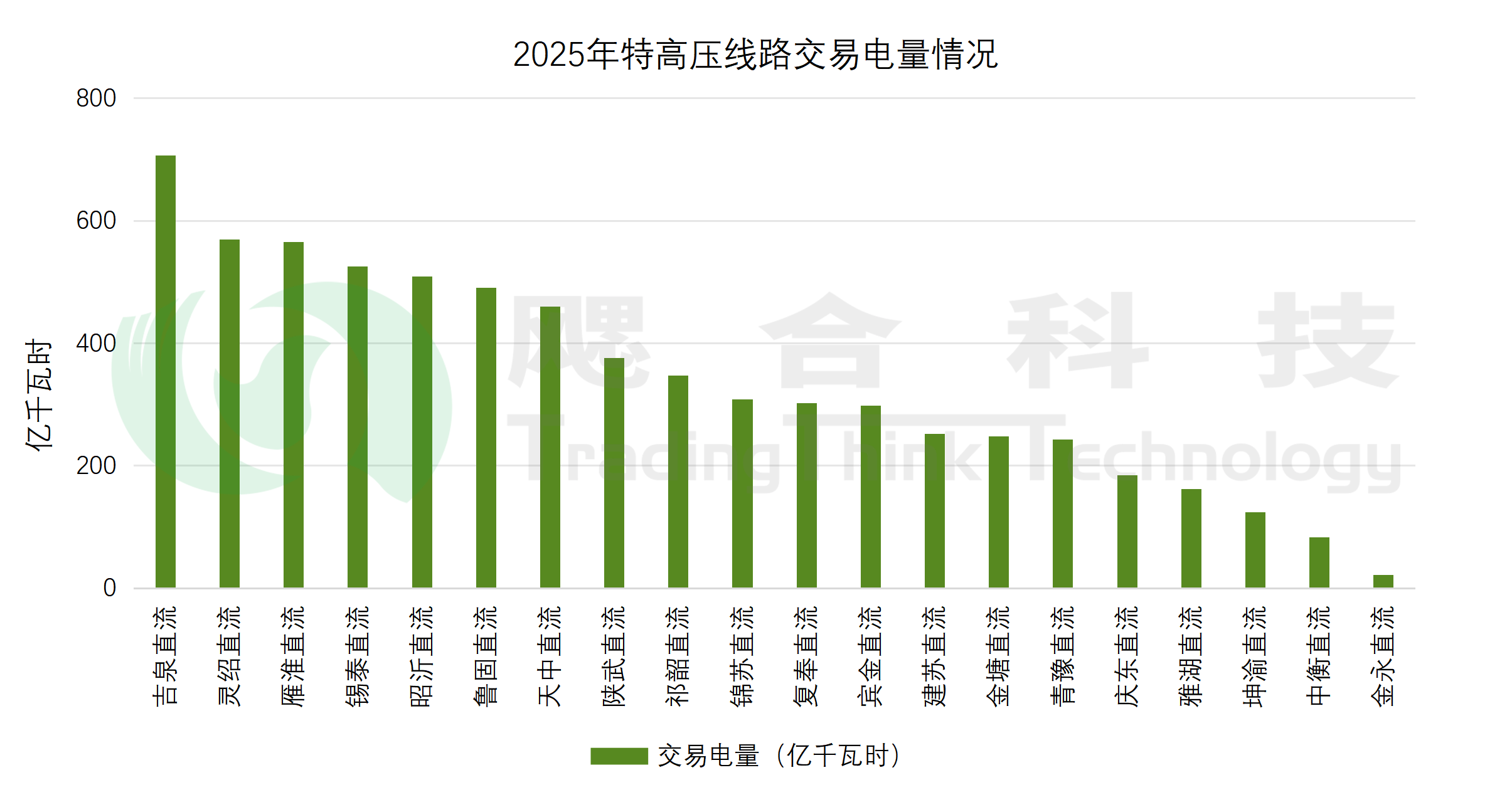 下图线条越宽、颜色越深表示特高压线路的交易电量越多,2025年特高压直流交易电量达到6778亿千瓦时,同比增长10.2%。其中,吉泉、灵绍、雁淮直流通道交易电量最高,分别为707亿、569亿、565亿千瓦时。新疆、宁夏、山西、蒙西对华东区域的输电较多,西北区域的西电东送支撑作用显著。