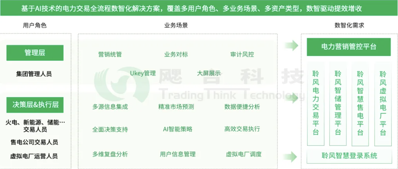 飔合科技聆风数智产品矩阵在关键的电价预测、交易模拟和交易复盘环节构建了多套先进的算法模型,依托大数据与AI大模型技术,以“数据贯通+智能算法+场景适配”为架构,不仅实现电力交易全流程数字化,更深度挖掘数据资产价值,覆盖多角色、多业务场景、多资产类型,最终形成"预测-决策-执行-优化"的业务闭环,推动了业务向全面智能化、可视化演进。