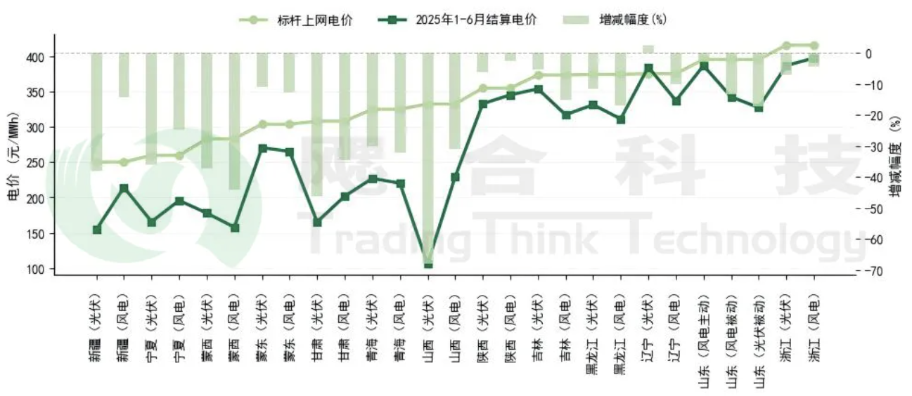 这一核心观点的价值随着各省136号文的逐渐落地愈发凸显,“交易”在场站收益模型中的权重也显著上升。然而,随着新能源装机占比快速提升和市场进程加速,新能源电站受电网安全约束、市场竞争加剧及新能源出力同质化等多重因素影响,结算电价普遍呈现低于标杆电价、波动性强等特点。尤其在山西、甘肃等新能源禀赋较好的省份,对比标杆电价下浮幅度可达度电0.1元以上,场站收益面临严峻挑战。