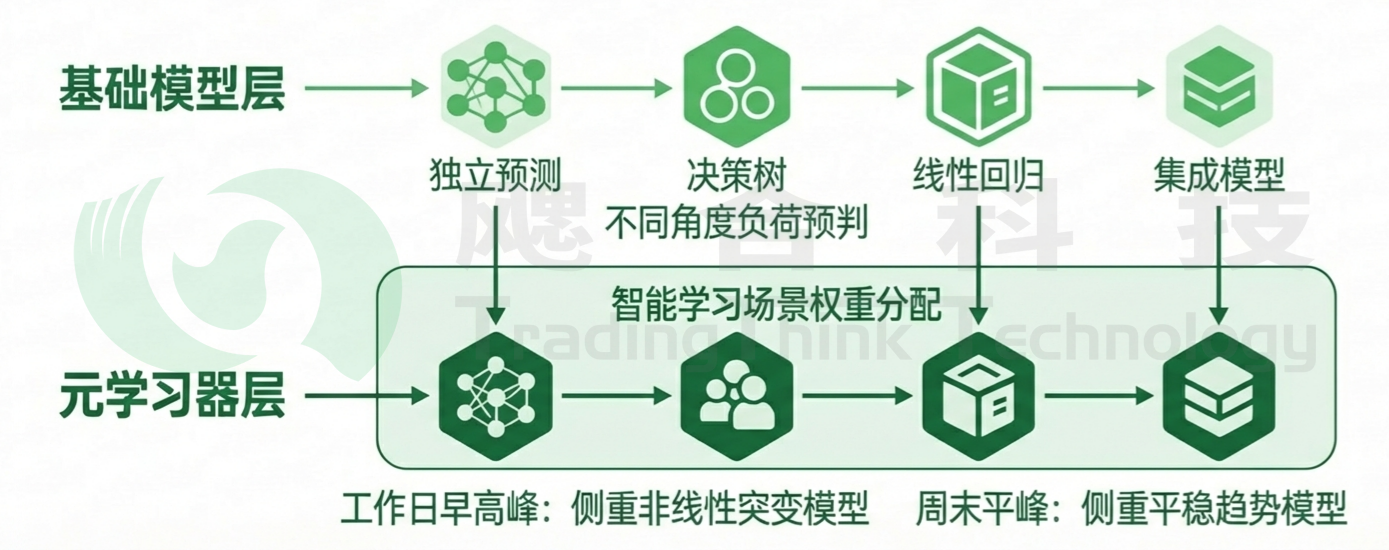 单一模型各有优劣,而多模型融合学习通过两层架构实现优势互补 —— 第一层让多个基础模型独立预测,每个模型从不同角度对负荷进行预判;第二层由元学习器智能学习 “不同场景下该侧重哪个模型”:工作日早高峰时赋予适配非线性突变模型更高的权重,周末平峰时段则提升适配平稳趋势模型的权重,同时通过交叉验证避免模型 “作弊”,确保对未知数据也有良好的预测能力。