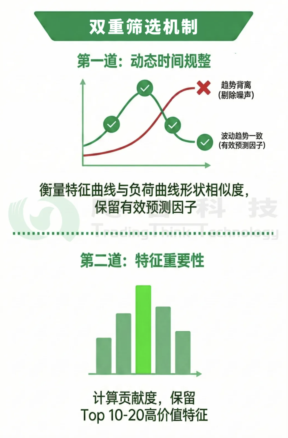 第一道筛选通过动态时间规整技术衡量特征曲线与负荷曲线的“形状相似度”。如果某个特征的时间序列曲线与负荷曲线的波动趋势高度一致,那么这个特征就是有效的预测因子;反之,如果特征曲线与负荷曲线背道而驰或毫无规律,那就是噪声特征需要剔除。